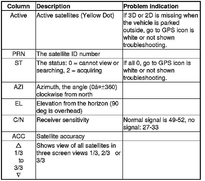 By pressing and holding the MENU button for 2 seconds, a GPS Detail screen appears. This screen displays real time incoming satellite positional data when the vehicle is outside in the open. The information shown on this screen is for factory use.