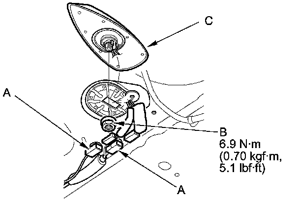 3. Remove the nut (B) and the AM/FM/XM antenna (C).