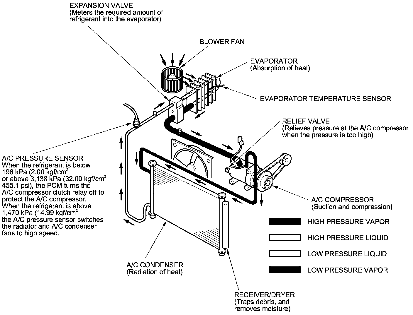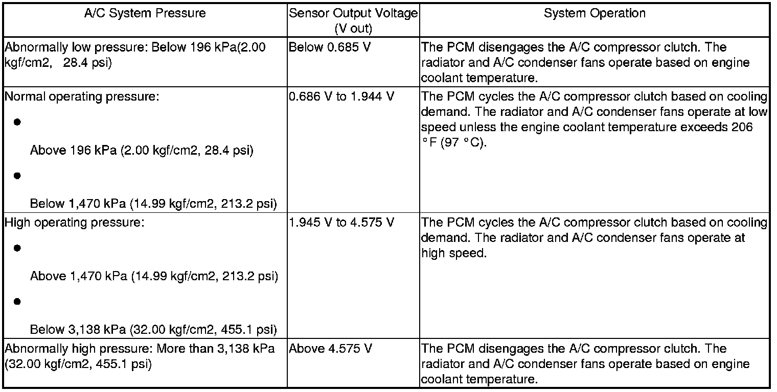 NOTE: When the refrigerant is below 196 kPa (2.00 kgf/cm2, 28.4 psi) or above 3,138 kPa (32.00 kgf/cm2, 455.1 psi), the PCM turns the A/C compressor clutch relay off to protect the A/C compressor. When the refrigerant pressure is above 1,470 kPa (14.99 kgf/cm2, 213.2 psi), the PCM switches the radiator and A/C condenser fans to high speed.