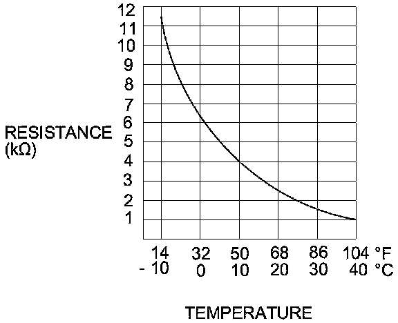 3. Compare the resistance reading between terminals No. 1 and No. 2 of the outside air temperature sensor with the specifications shown in the graph; the resistance should be within the specifications.