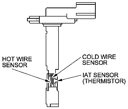 The mass air flow (MAF) sensor/intake air temperature (IAT) sensor contains a hot wire sensor, a cold wire sensor, and a thermistor. It is located in the intake air passage. The resistance of the hot wire sensor, the cold wire sensor, and the thermistor changes due to intake air temperature and air flow. The control circuit in the MAF sensor controls the current to keep the hot wire at a set temperature. The current is converted to voltage in the control circuit, then output to the PCM.