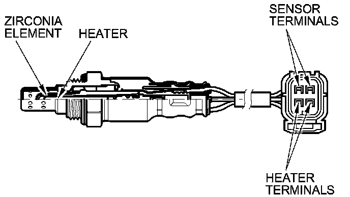 The secondary HO2S detects the oxygen content in the exhaust gas downstream of the warm up three way catalytic converter (WU-TWC), and sends signals to the PCM. To stabilize its output, the sensor has an internal heater. The PCM compares the HO2S output with the A/F sensor output to determine catalyst efficiency. A secondary HO2S is installed in each bank downstream of the WU-TWC.