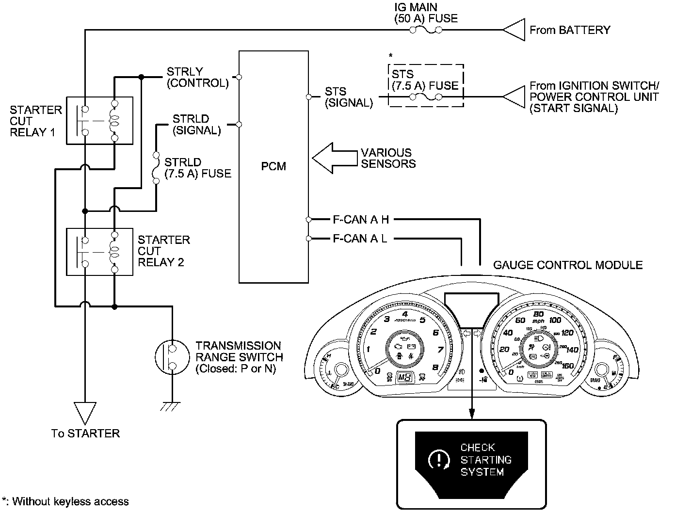 - When the ignition switch is turned to START (III), or the engine start/stop button is pressed to select the START mode, the PCM applies current to starter cut relay 1 and starter cut relay 2, then battery voltage is applied to the starter solenoid, and starter motor runs.