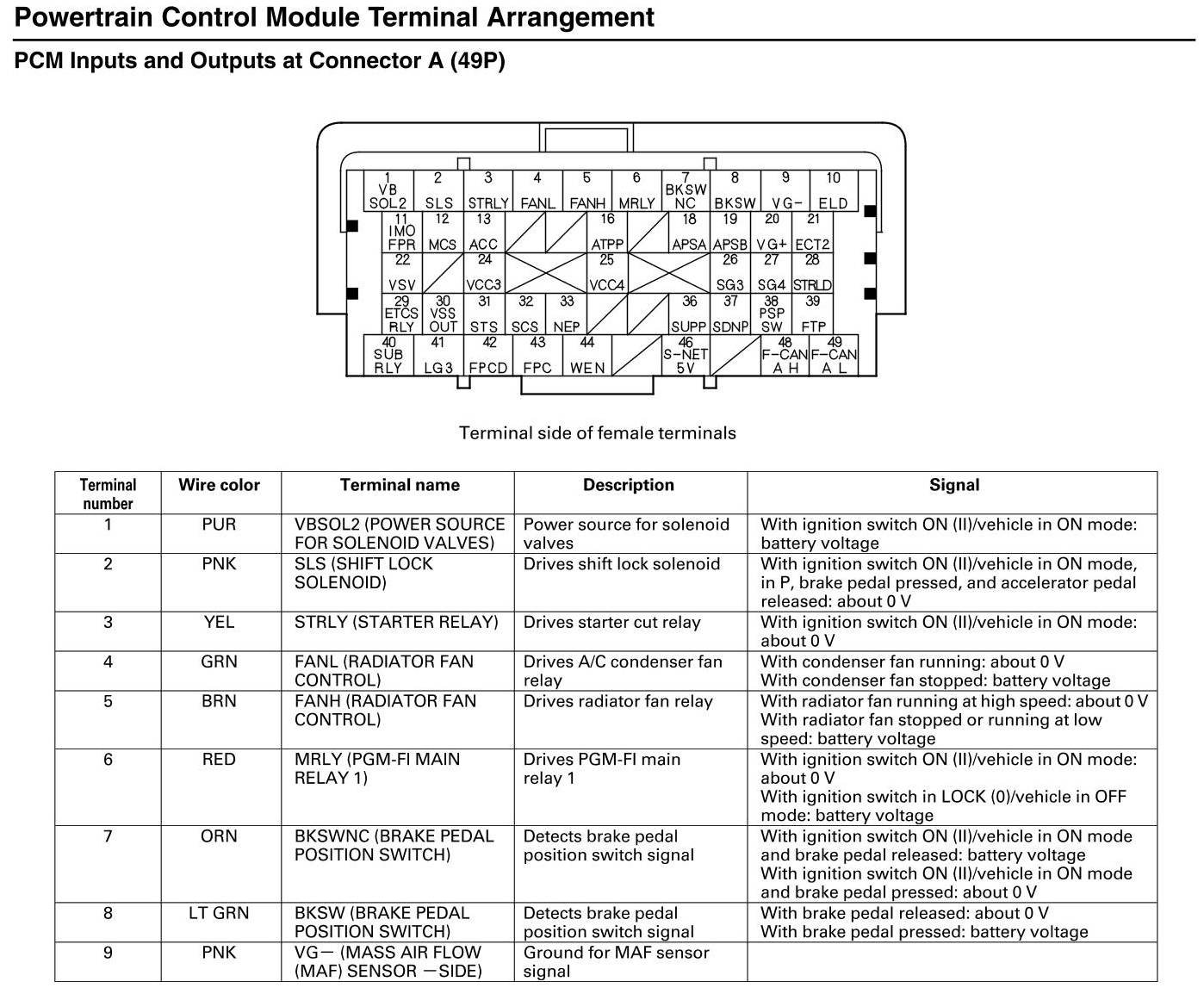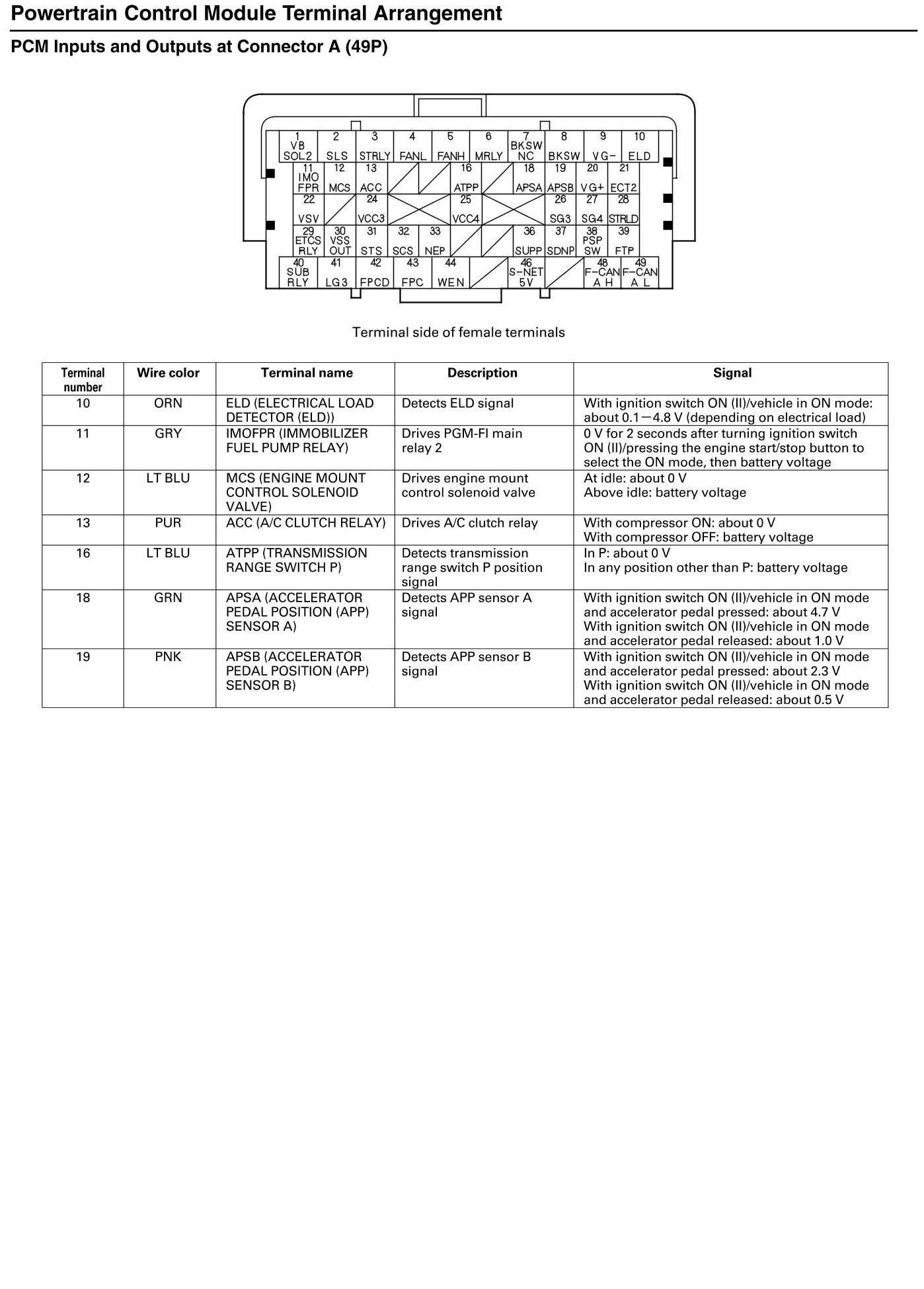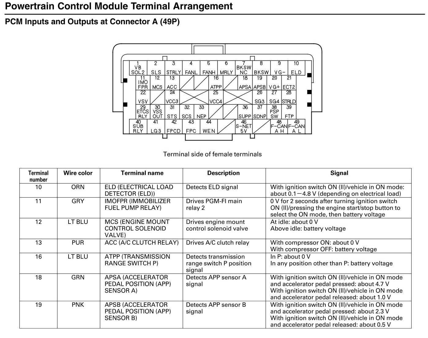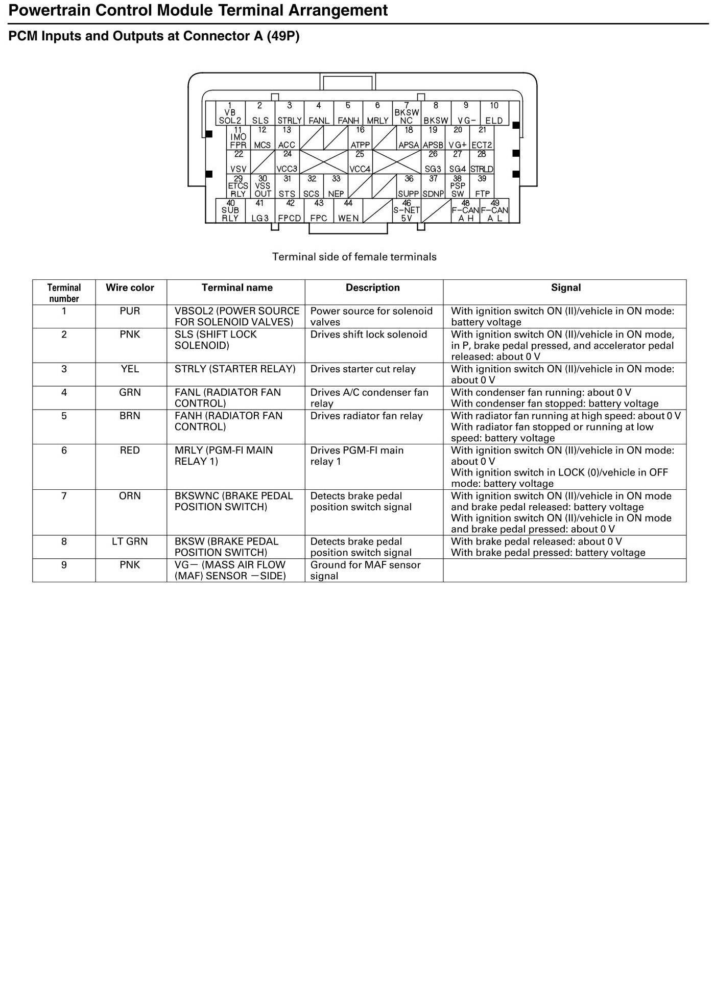 PCM Inputs and Outputs at Connector A