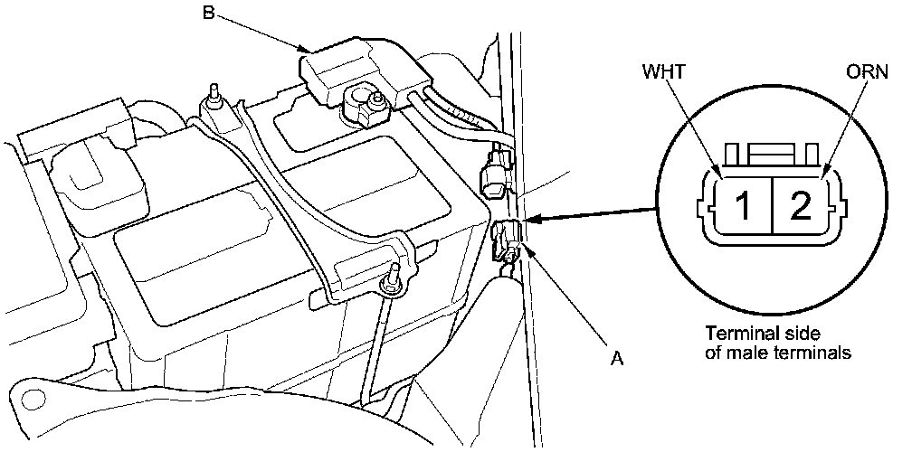 1. Disconnect the 2P connector (A) from the battery sensor (B).