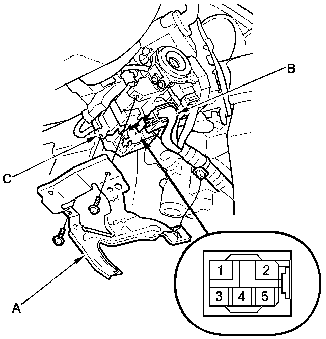 4. Disconnect the 5P connector (B) from the ignition switch (C).