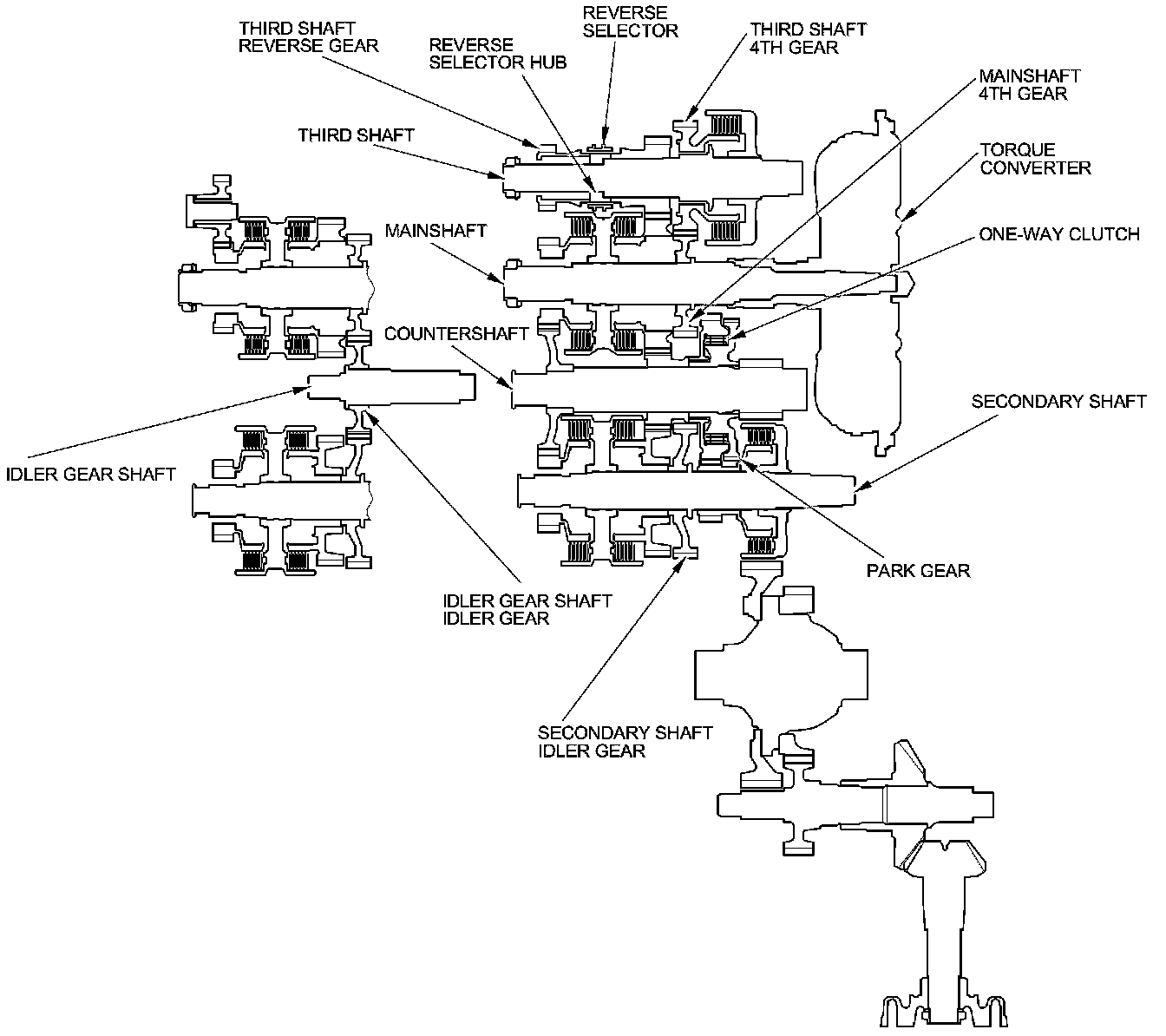 - The countershaft 1st gear drives the park gear splined with the countershaft via the one-way clutch.