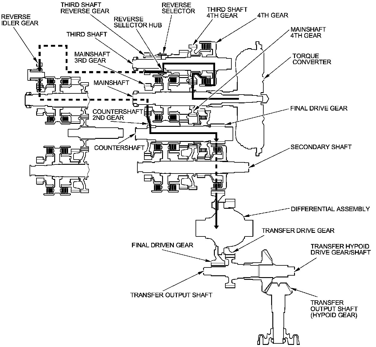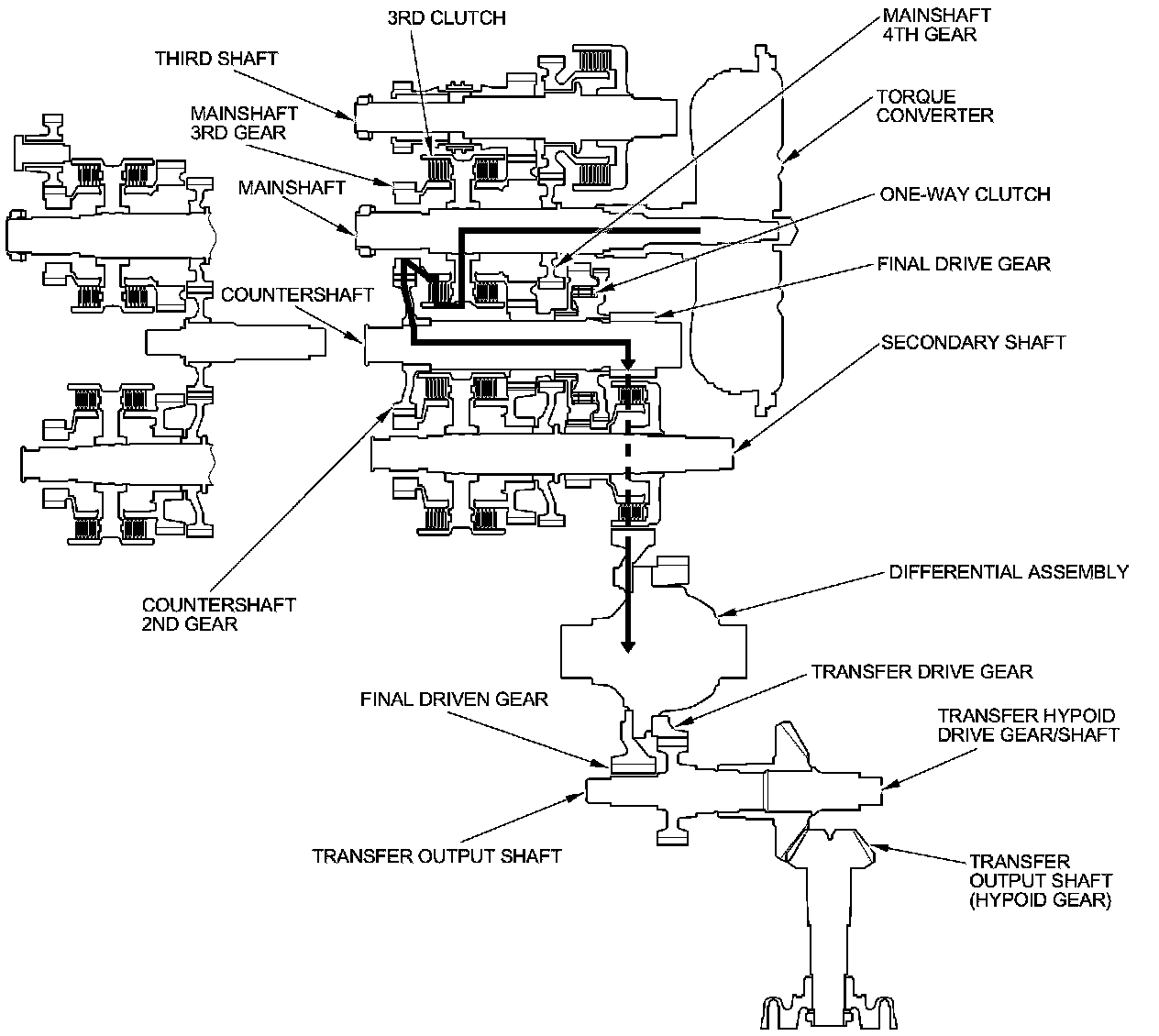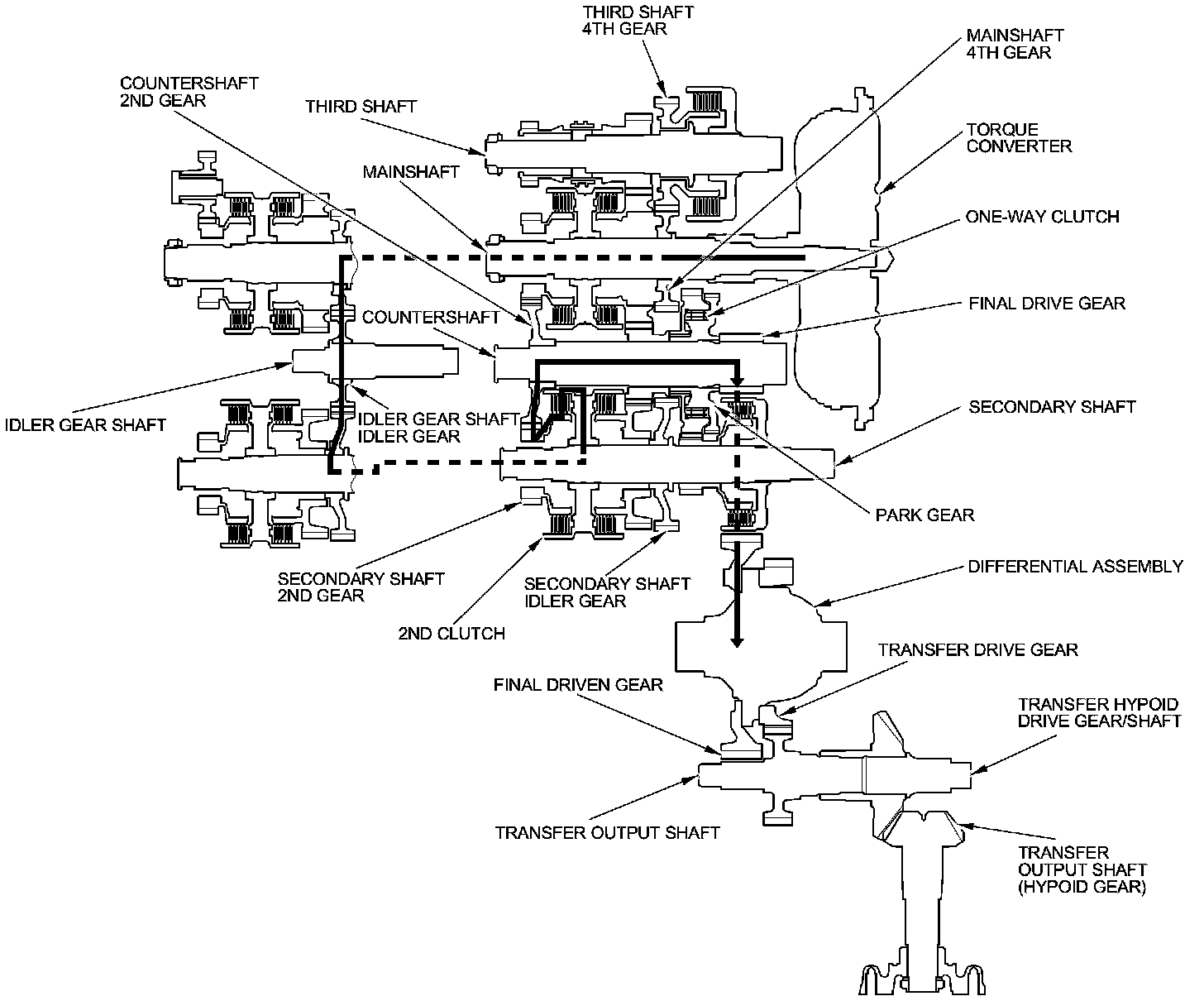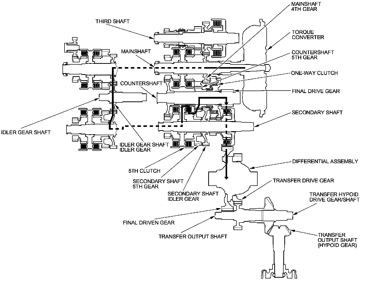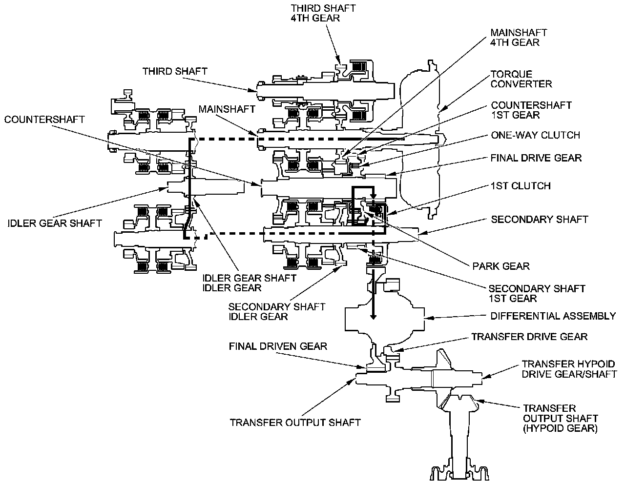 - As the final driven gear turns the differential assembly, power is transmitted through the transfer drive gear to the transfer output shaft that drives the transfer hypoid drive gear/shaft and the transfer output shaft (hypoid gear).