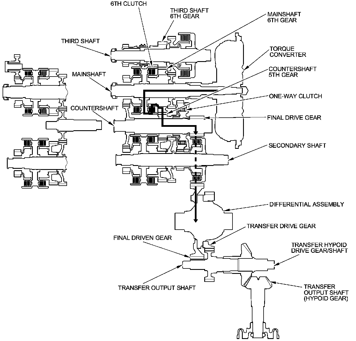 - Mainshaft rotation is transmitted from the mainshaft 6th gear engaged with the 6th clutch to the countershaft 5th gear splined with the countershaft.
