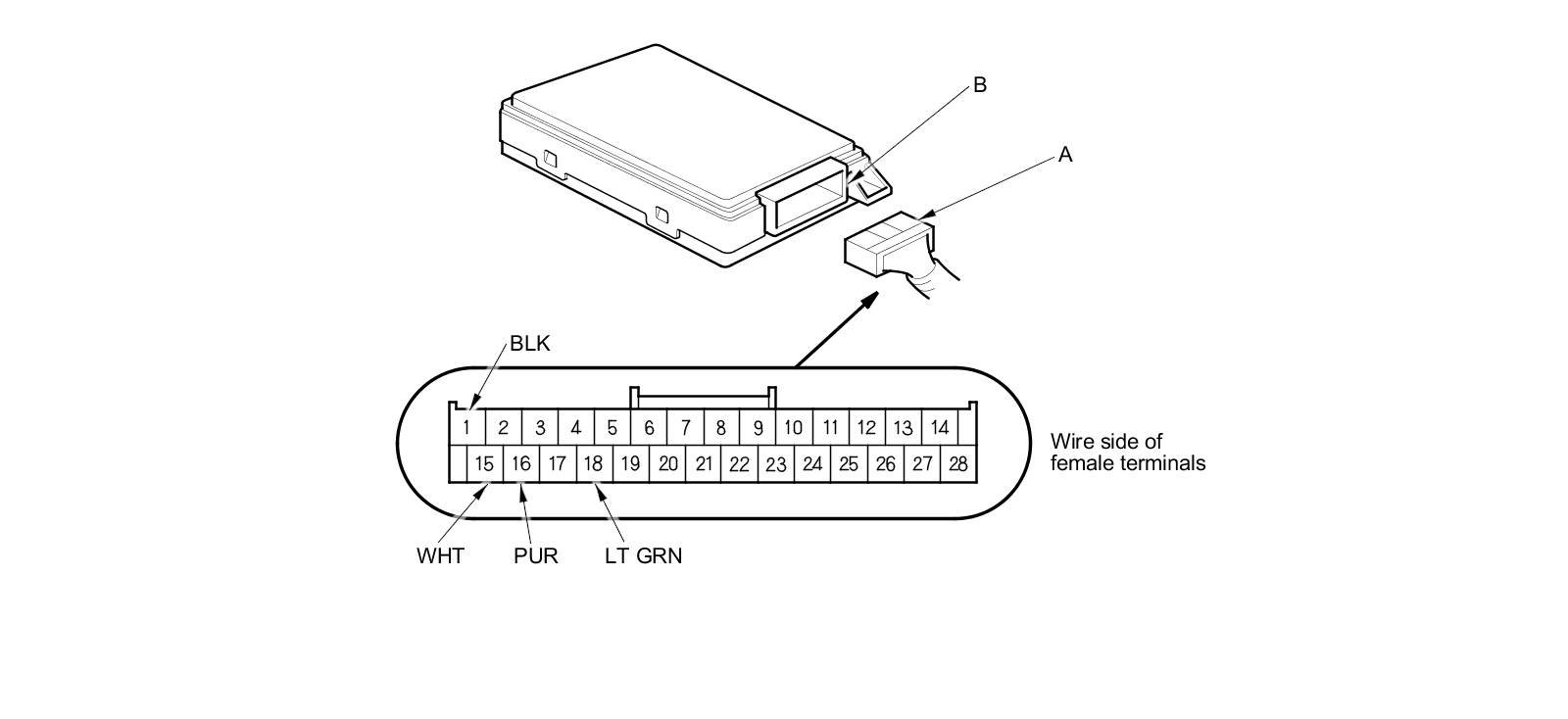 2. Inspect the connector (A) and socket (B) terminals for a good pin fit to be sure they are all making good contact.