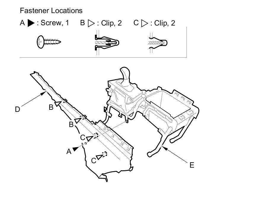 3. Remove the screw (A), and detach the clips (B, C) by pulling the driver's console panel (D) back, then remove if from the console frame (E).