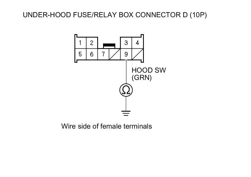 7. Check for continuity between under-hood fuse/relay box connector D (10P) terminal No. 9 and body ground.