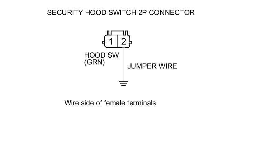 9. Connect security hood switch 2P connector terminal No. 2 and body ground with a jumper wire.