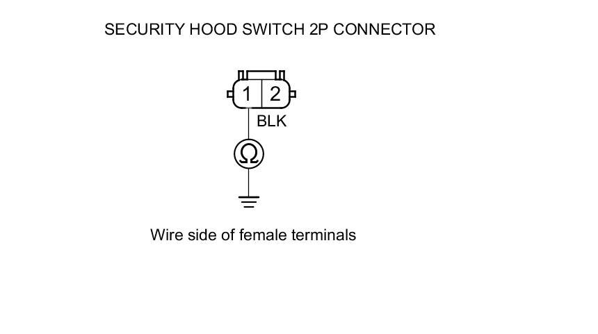 11. Check for continuity between security hood switch 2P connector terminal No. 1 and body ground.