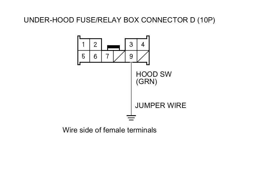 12. Connect under-hood fuse/relay box connector D (10P) terminal No. 9 and body ground with a jumper wire.