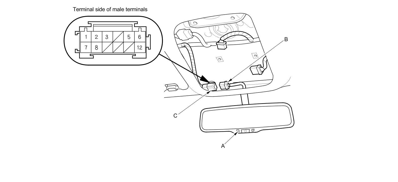 5. Disconnect the 12P connector (B) from the roof wire harness (C).