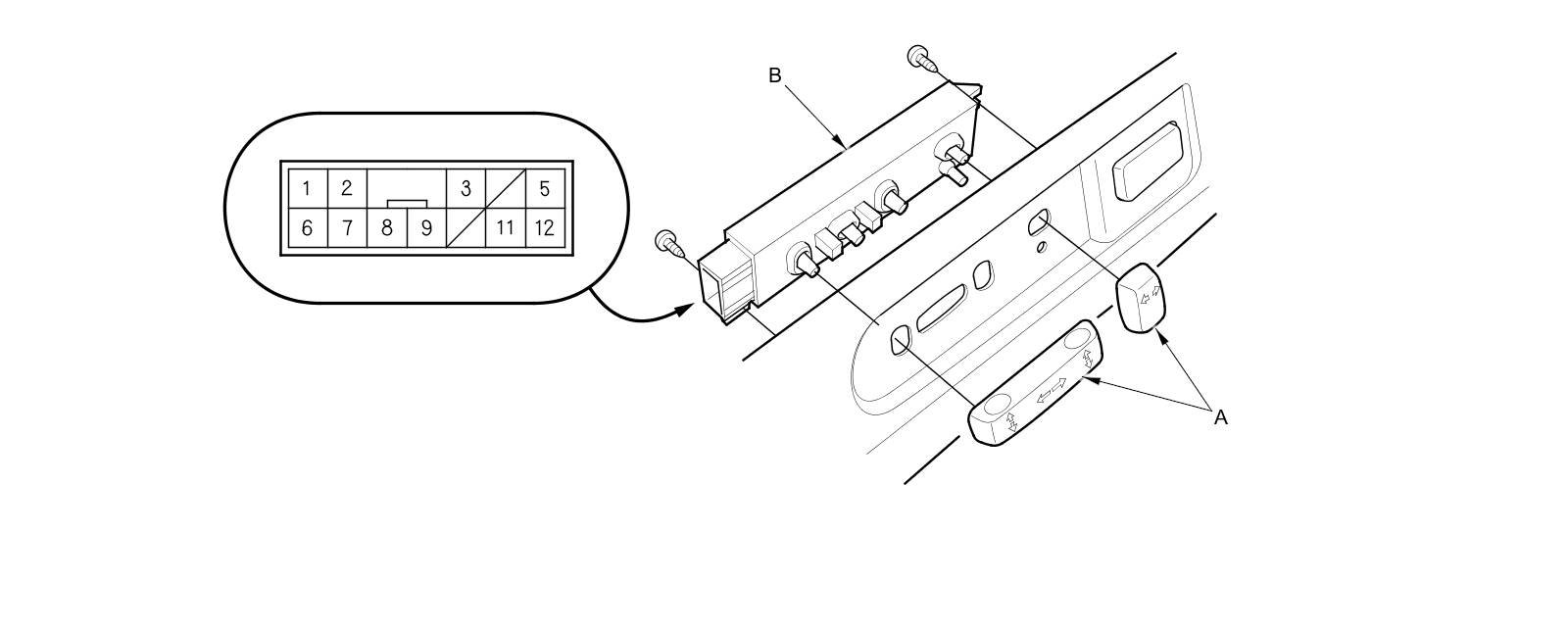 1. Remove the power seat adjustment switch knobs (A) and recline cover from the driver's power seat Front Seat Disassembly/Reassembly, then remove the two screws and the power seat adjustment switch (B).