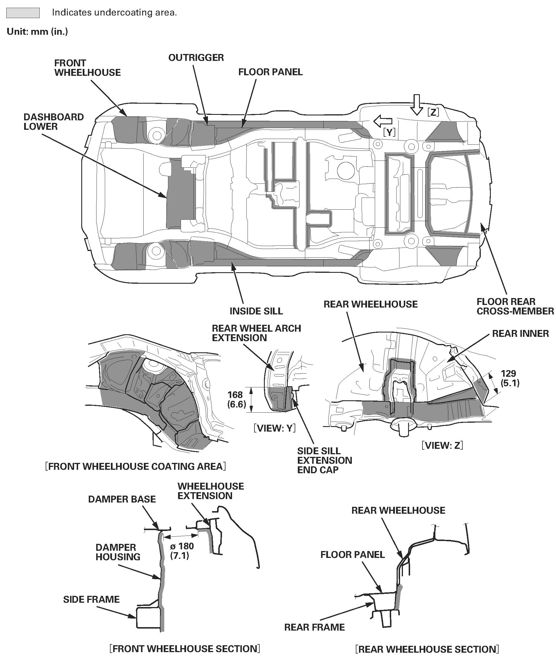 Front wheelhouse, rear wheelhouse, and dashboard lower coating thickness 0.5 mm (0.02 in.).