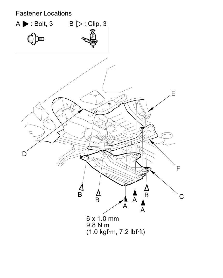 1. Remove the bolts (A), and the clips (B), then remove the front undercover (C) from the splash shield (D), the front suspension subframe (E), and the front subframe stiffener (F).