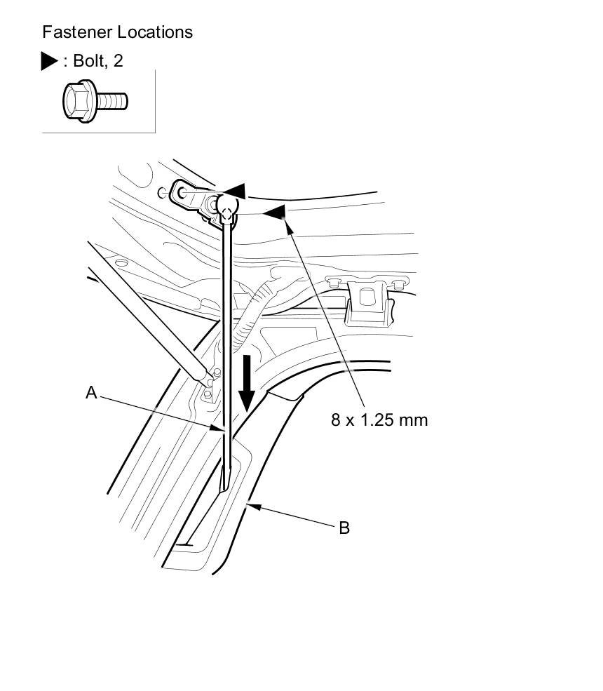 2. Remove the pivot bracket mounting bolts, then push the power tailgate rod (A) in the quarter pillar trim (B).