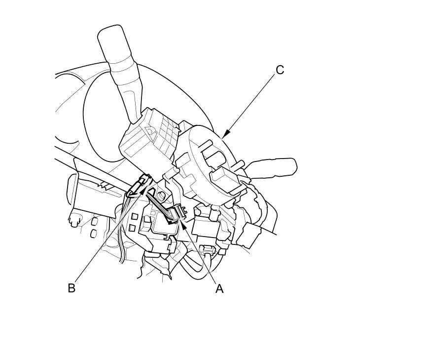 3. Disconnect the steering angle sensor 5P connector (A) and the clip (B) from the combination switch assembly/cable reel (C).