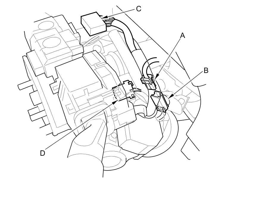 4. Disconnect the dashboard wire harness 4P connector (A) from the cable reel 4P connector and remove the clip (B), then disconnect the dashboard wire harness 20P connector (C) and the wiper/washer switch 8P connector (D).