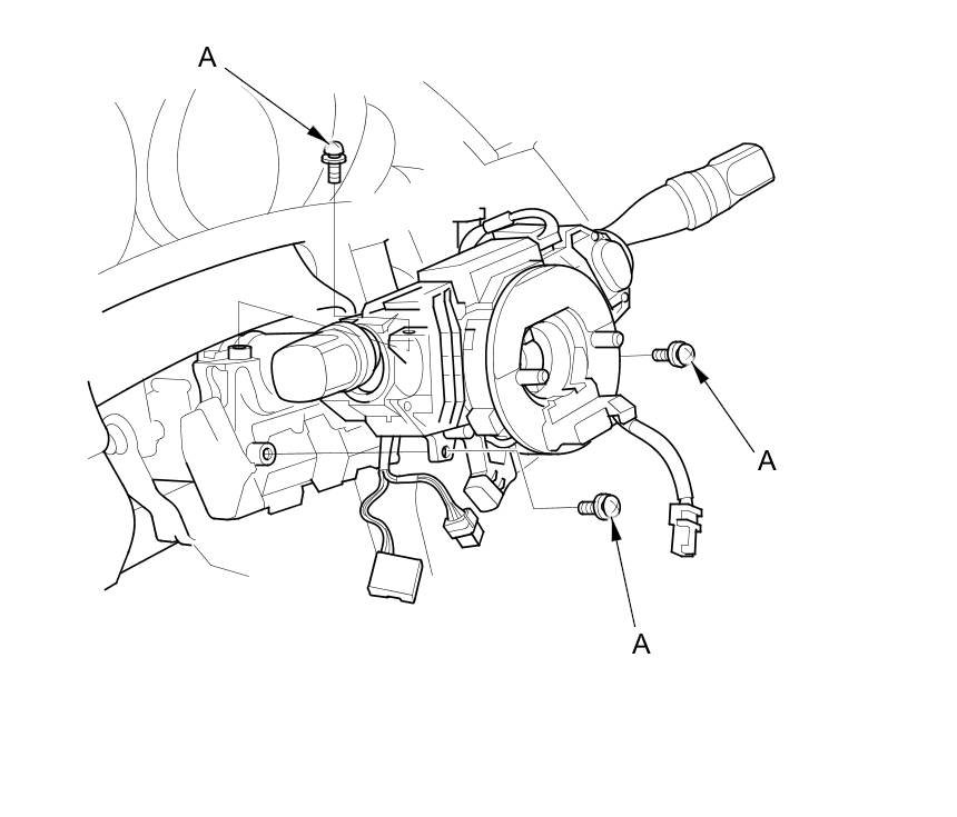 5. Remove the combination switch assembly/cable reel mounting screws (A).