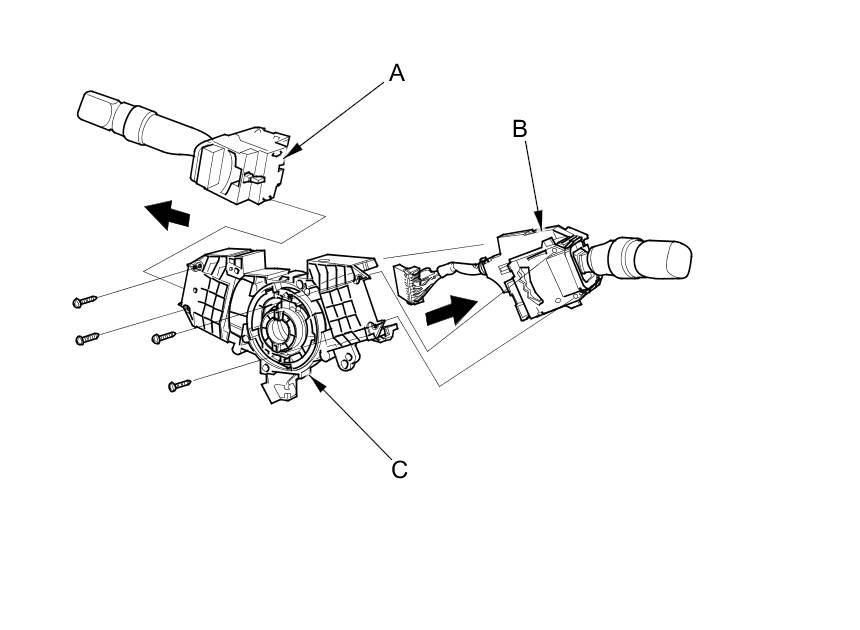 8. Remove the combination light switch (A) and the wiper/washer switch (B) from the combination switch body assembly (C).