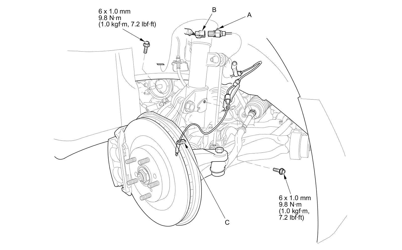 3. Remove the bolts and the wheel speed sensor (C).