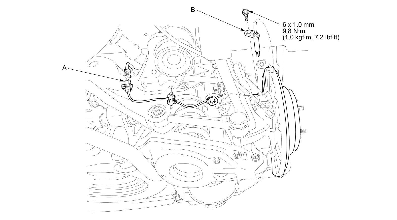 2. Remove the clip (A), then disconnect the wheel speed sensor connector (B).