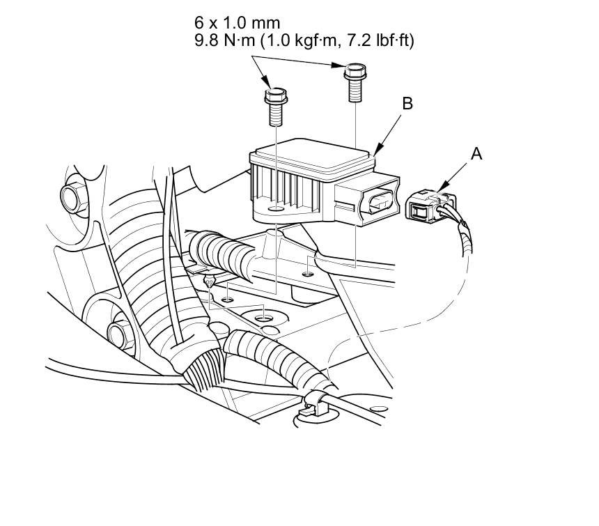 4. Remove the sensor mounting bolts, then remove the yaw rate-lateral/longitudinal acceleration sensor (B).