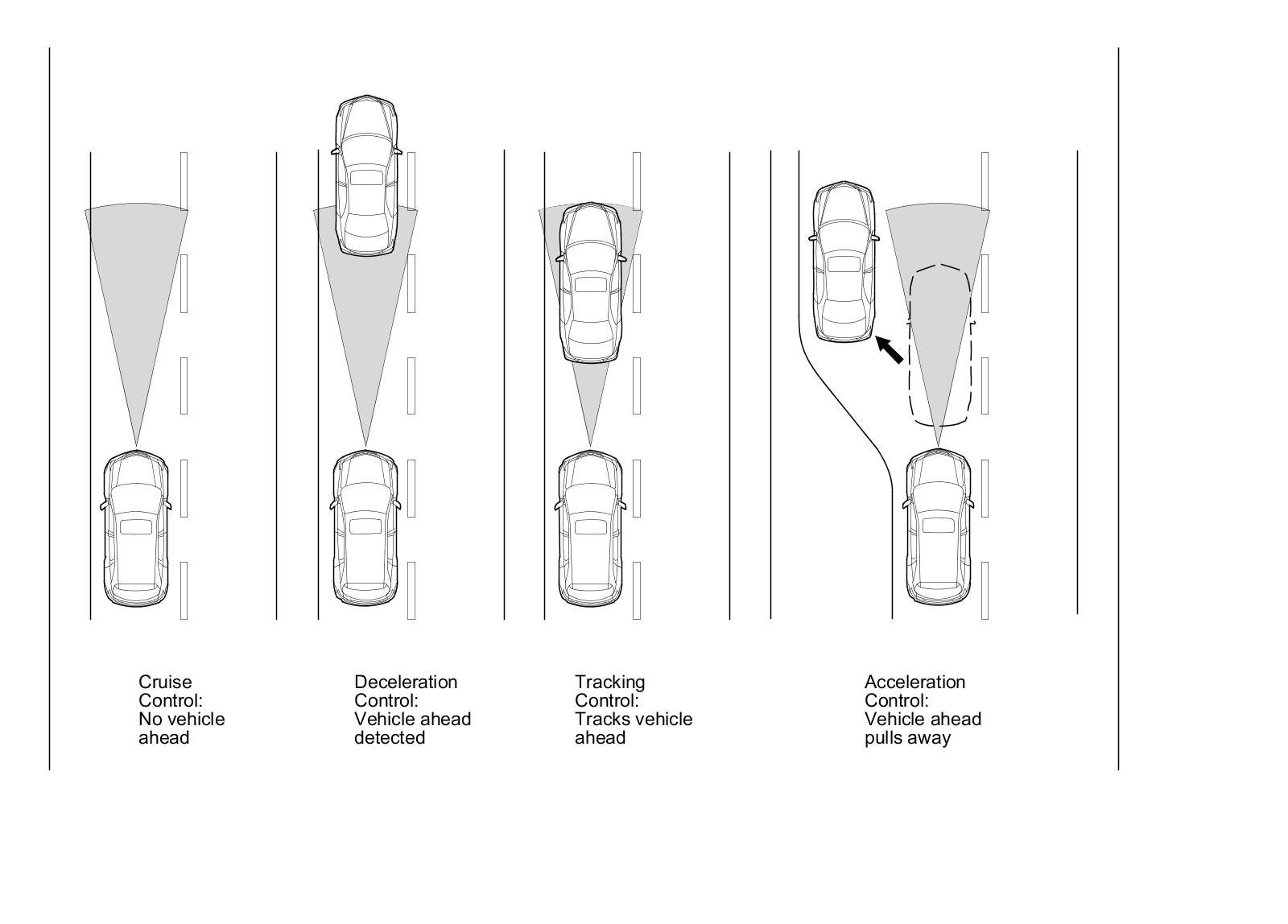 - If a slower vehicle ahead accelerates, the throttle is opened to accelerate the vehicle (up to the set speed) to maintain the following distance.