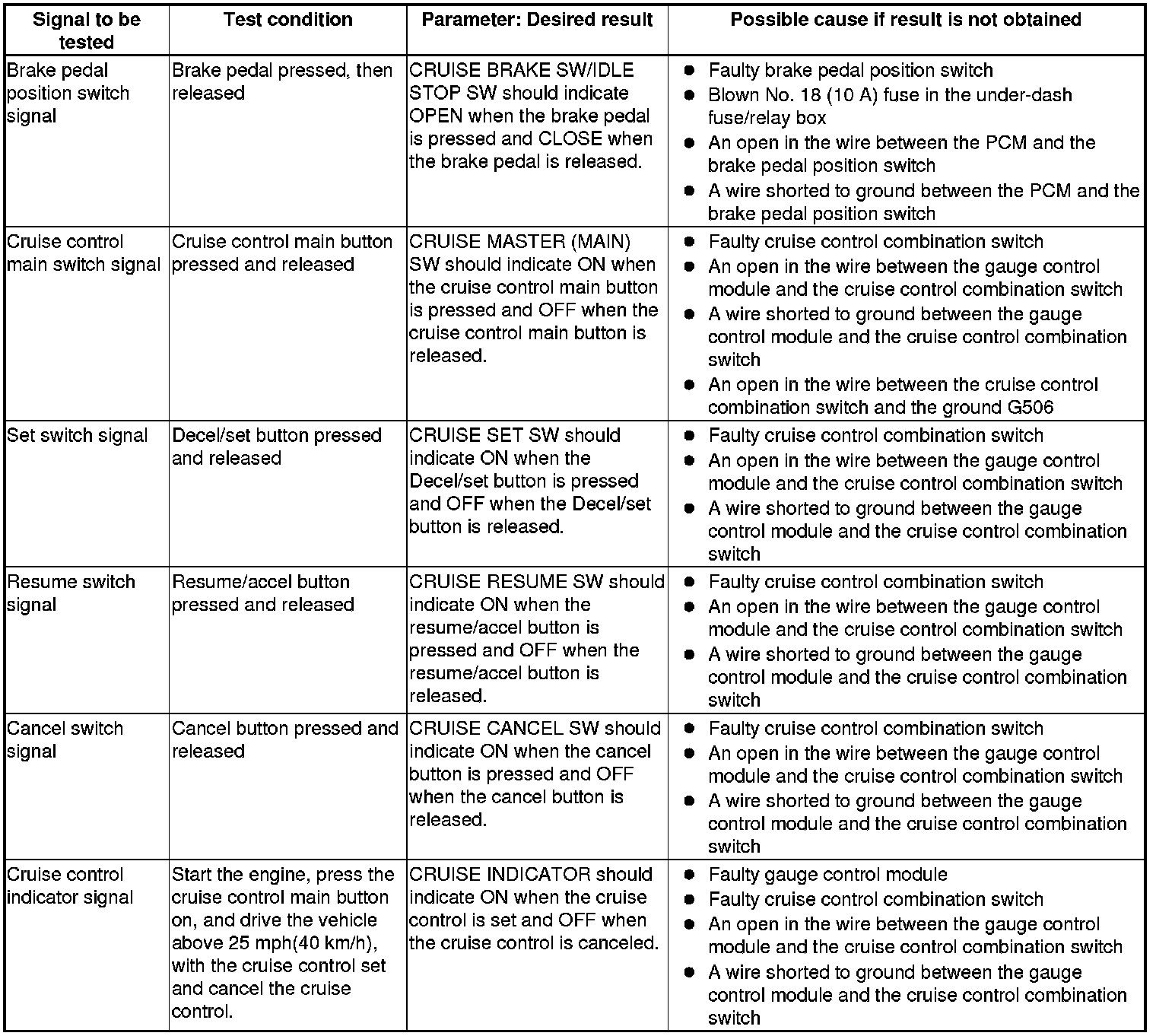 NOTE: Intermittent failures are often caused by loose circuit connections. While monitoring cruise control inputs, flex the circuit wires, and note if any of the test results change.