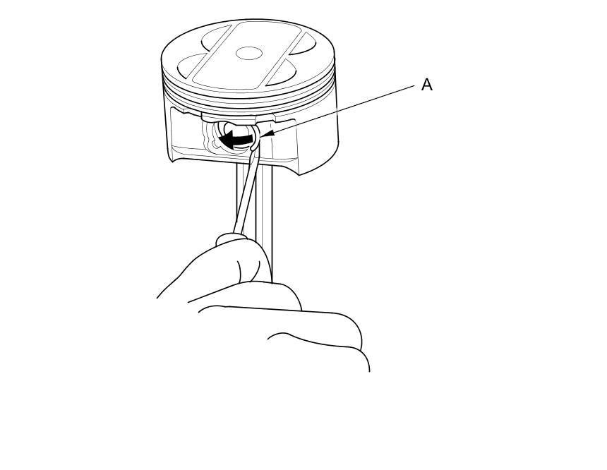 3. Remove snap rings (A) from both sides of each piston. Start at the cutout in the piston pin bore. Remove the snap rings carefully so they do not go flying or get lost. Wear eye protection.