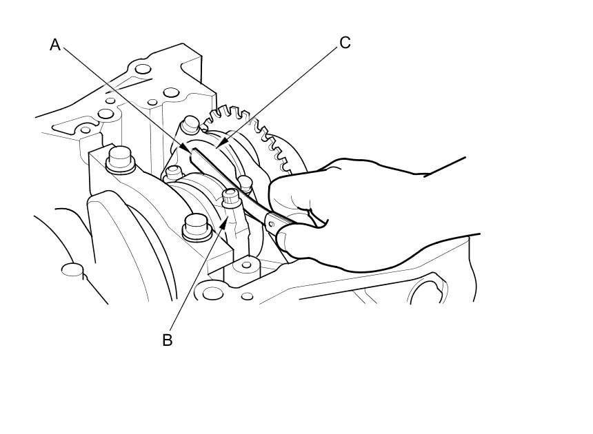 3. Measure the connecting rod end play with a feeler gauge (A) between the connecting rod (B) and the crankshaft (C).