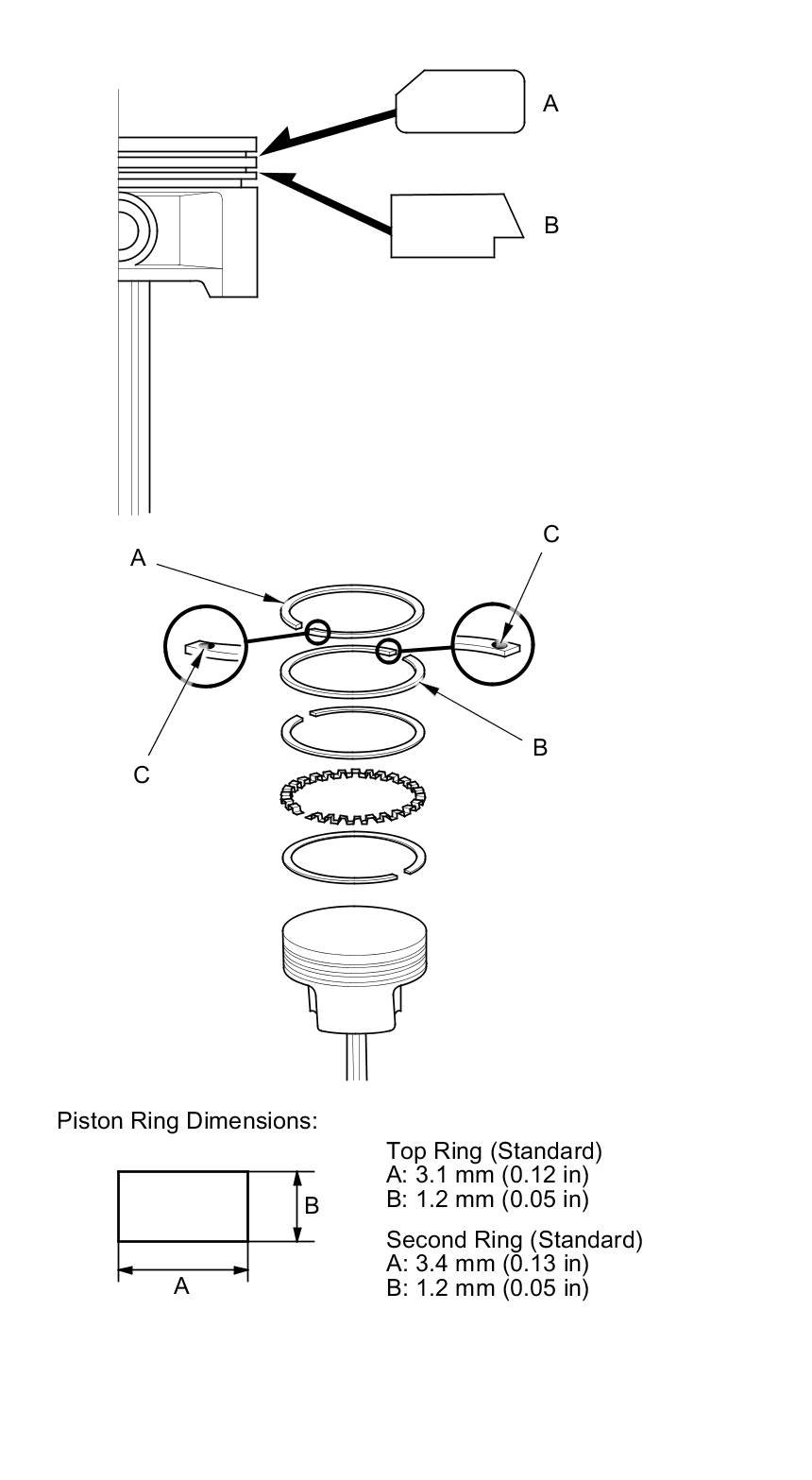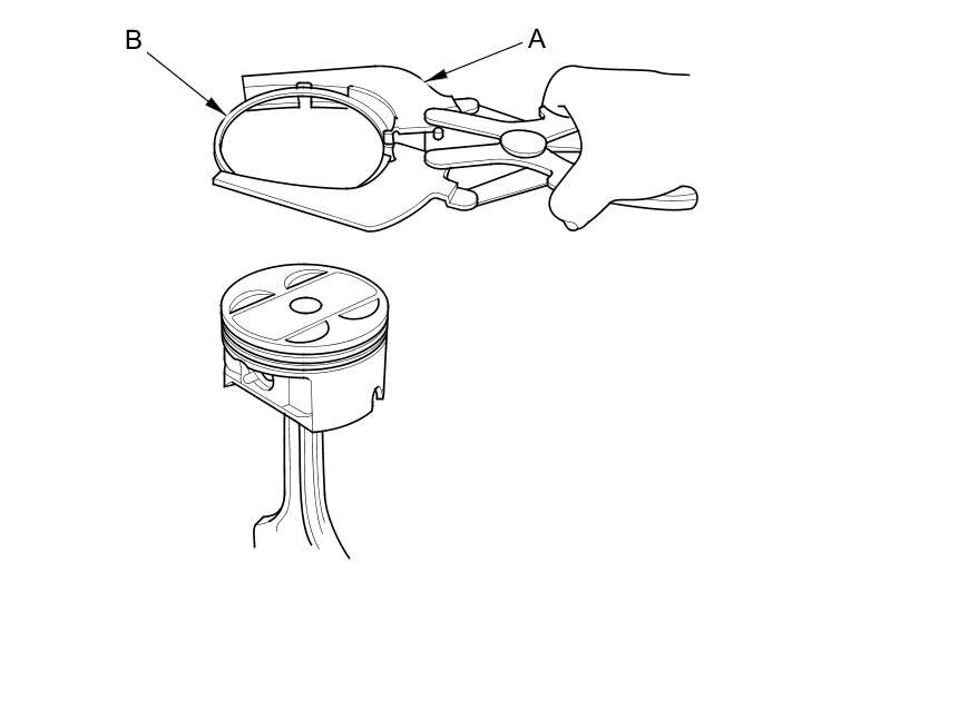 5. Measure the piston ring end-gap (B) with a feeler gauge: