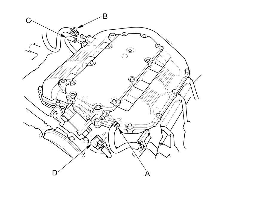 4. Disconnect the PCV hose (A), the brake booster vacuum hose (B), the vacuum hose (C), and the IMT actuator connector (D).