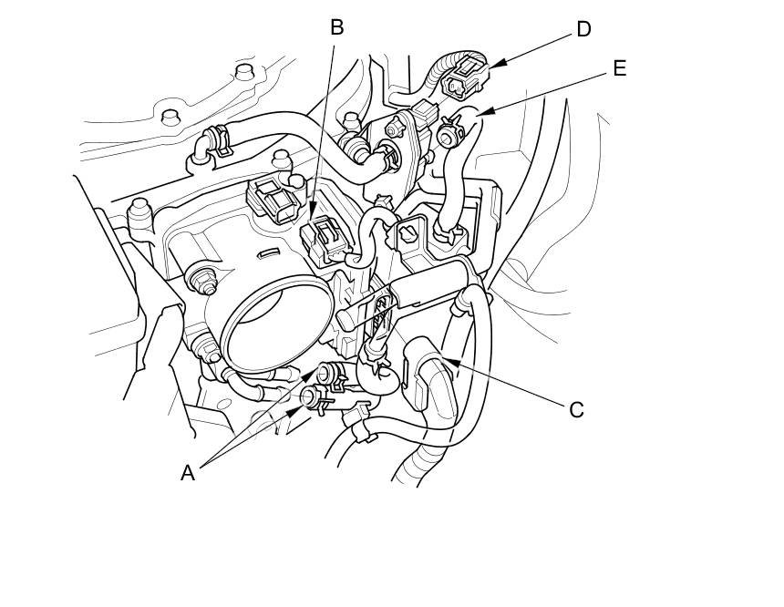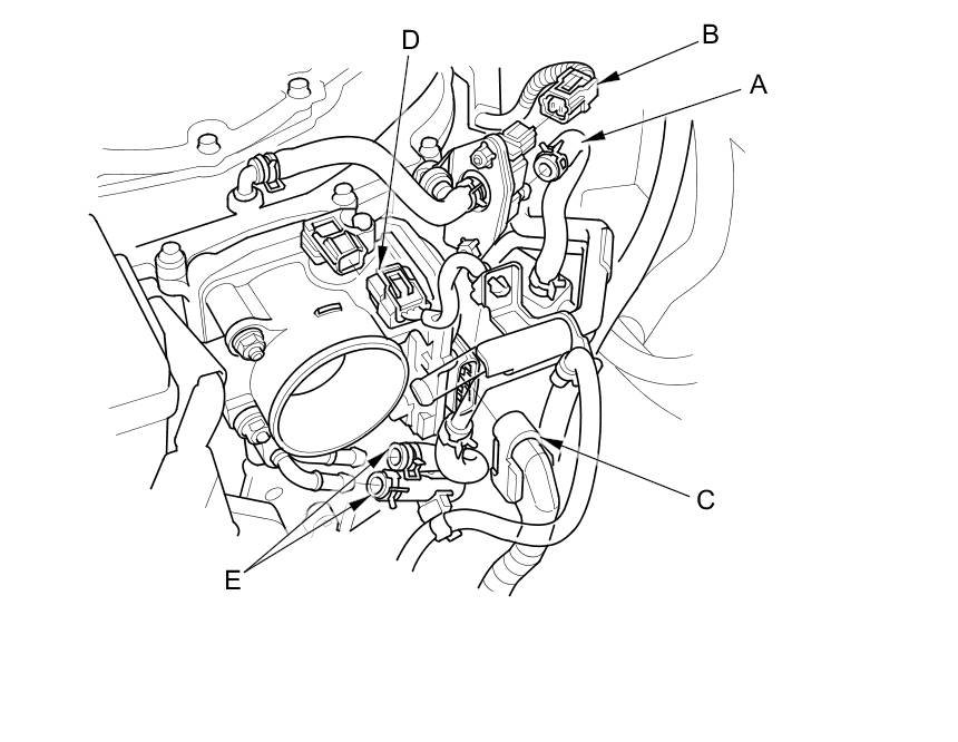 4. Connect the MAP sensor connector (B), the throttle actuator connector (C), the EVAP canister purge valve connector (D), and the EVAP canister purge hose (E).