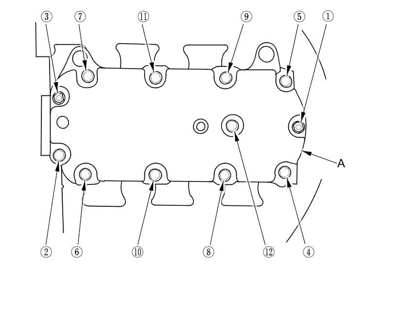 2. Install the upper cover (A). Tighten the bolts and nuts sequentially in three steps. Always use a new gasket.