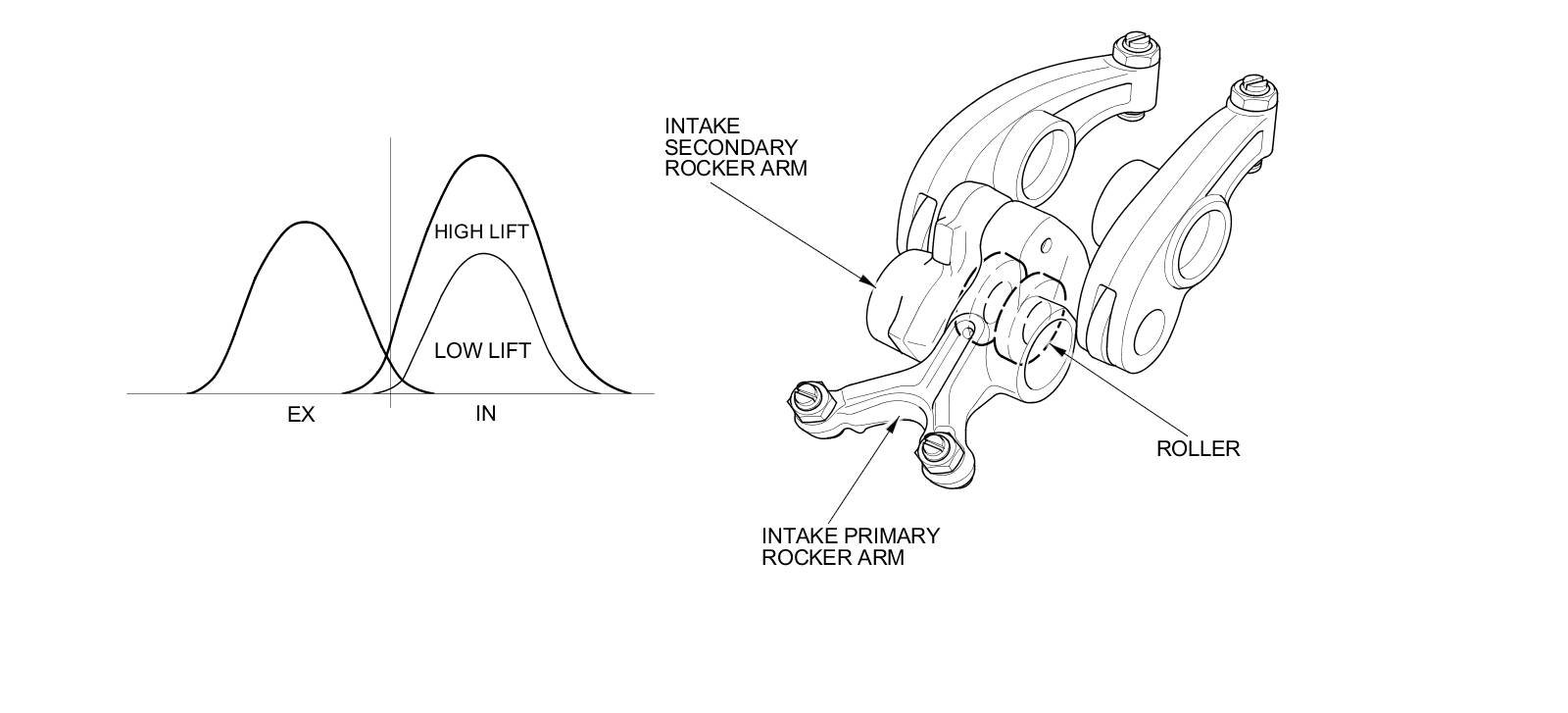 - The intake valve side has primary and secondary rocker arms. These rocker arms are locked and separated to change the cam profile by switching the oil passages. Roller rockers are used to minimize mechanical friction.
