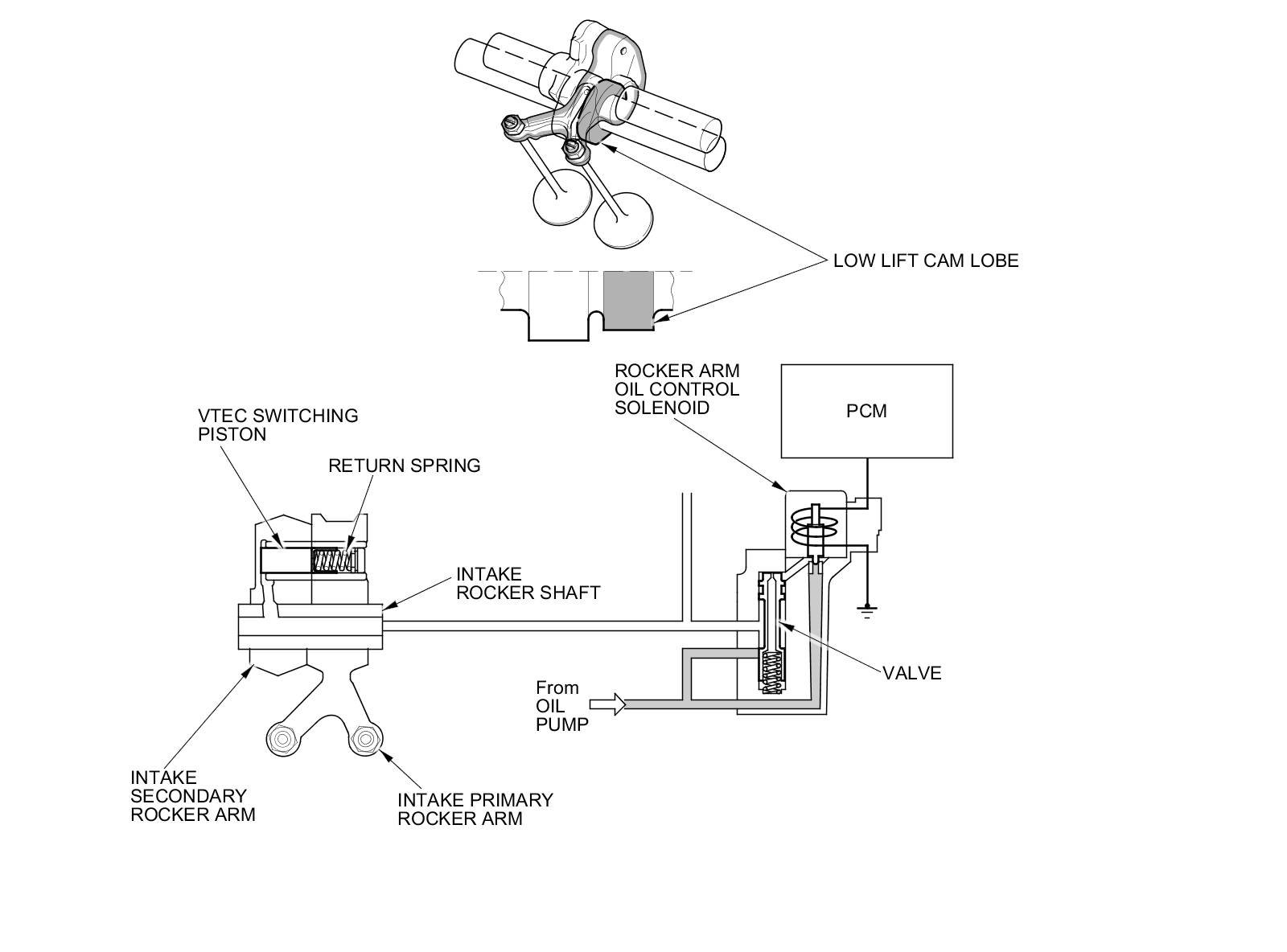 The rocker arm oil control solenoid is turned on by the PCM. Oil pressure from the rocker arm control solenoid enters into the intake secondary rocker arm via the rocker shaft, and it moves the VTEC switching piston in the intake secondary rocker arm. This causes the VTEC switching piston to slide into the primary rocker arm, locking the primary and secondary rocker arms together. Both intake rocker arms are lifted by the high lift cam lobe.