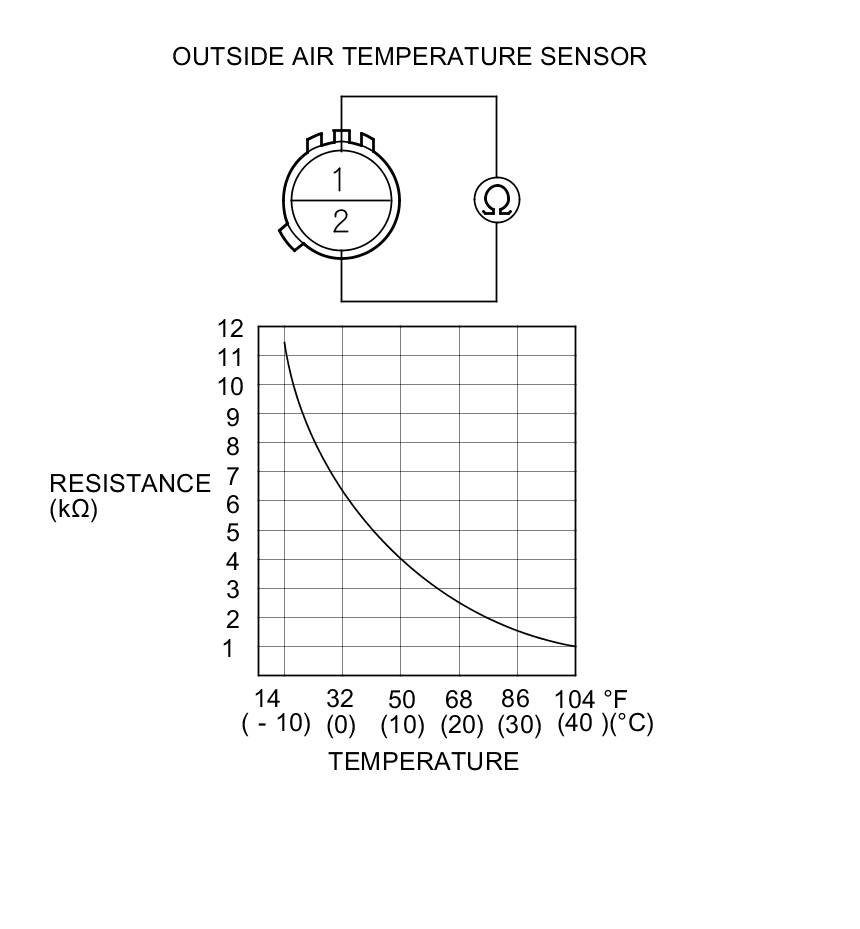 3. Compare the resistance reading between terminals No. 1 and No. 2 of the outside air temperature sensor with the specifications shown in the graph; the resistance should be within the specifications.