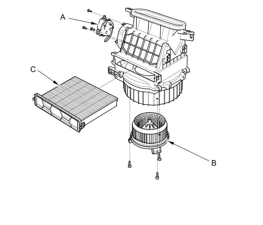 - The recirculation control motor (A), the front blower motor (B) and the dust and pollen filter (C) can be replaced without removing the blower unit.