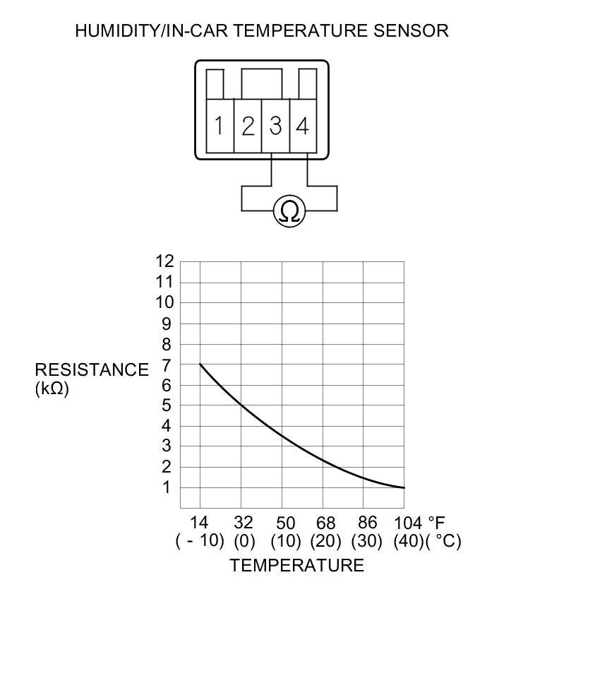 3. Compare the resistance reading between terminals No. 4 and No. 3 of the humidity/in-car temperature sensor with the specifications shown in the graph; the resistance should be within the specifications.
