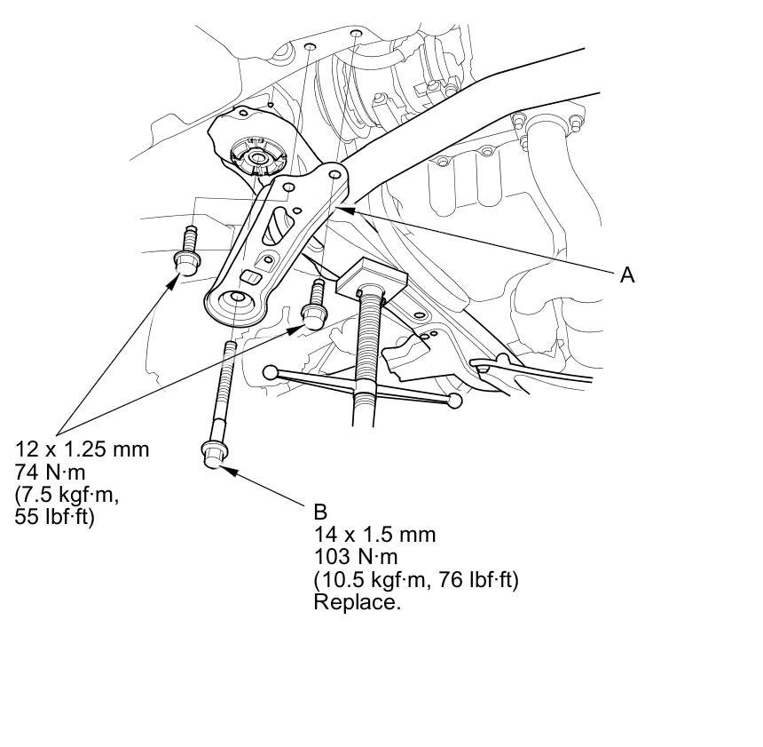 NOTE: Install the new front subframe mounting bolt (B).