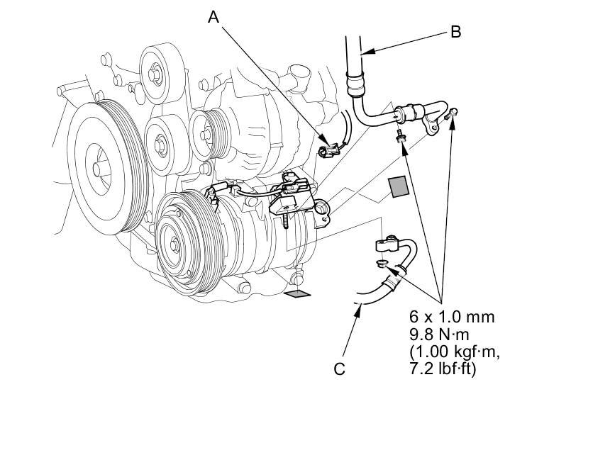 7. Disconnect the A/C compressor clutch connector (A). Remove the bolts and the nut, then disconnect the suction hose (B) and discharge hose (C) from the A/C compressor. Plug or cap the lines immediately after disconnecting them to avoid moisture and dust contamination.