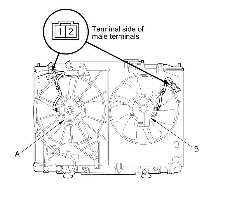 Disconnect the 2P connectors from the radiator fan motor (A) and the A/C condenser fan motor (B).