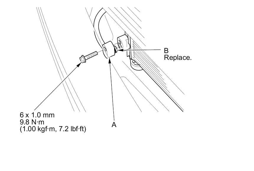 4. Remove the bolt, then disconnect the front receiver line (A) from the A/C condenser. Remove the O-ring (B).