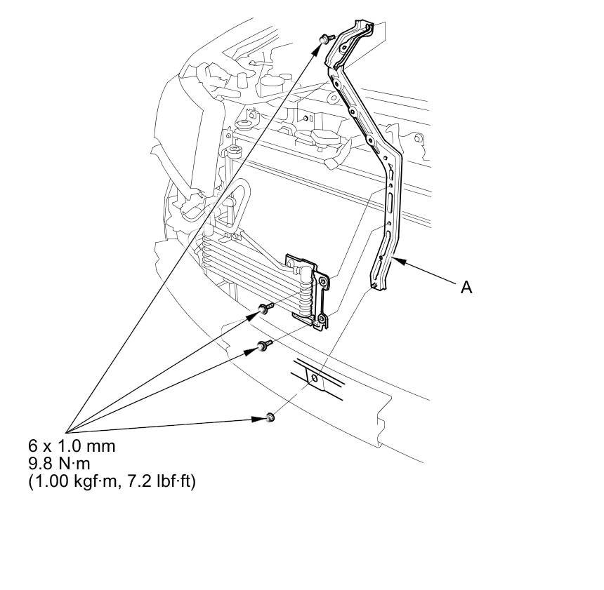 5. Without ACC: Remove the bolts, nut, and the ATF cooler bracket (A).