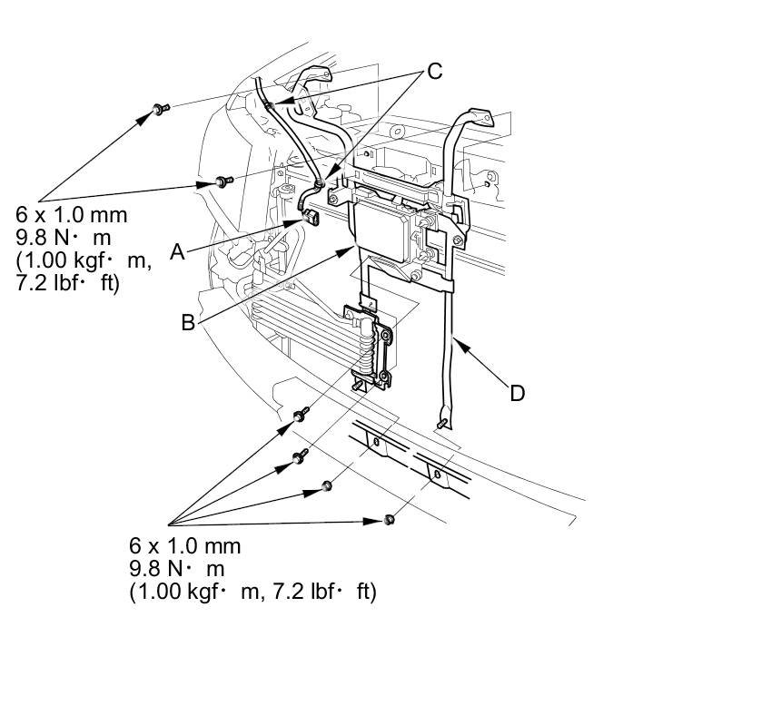 6. With ACC: Disconnect the 5P connector (A) from the millimeter wave radar (B), then detach the harness clips (C). Remove the bolts, nuts, and the millimeter wave radar bracket (D).